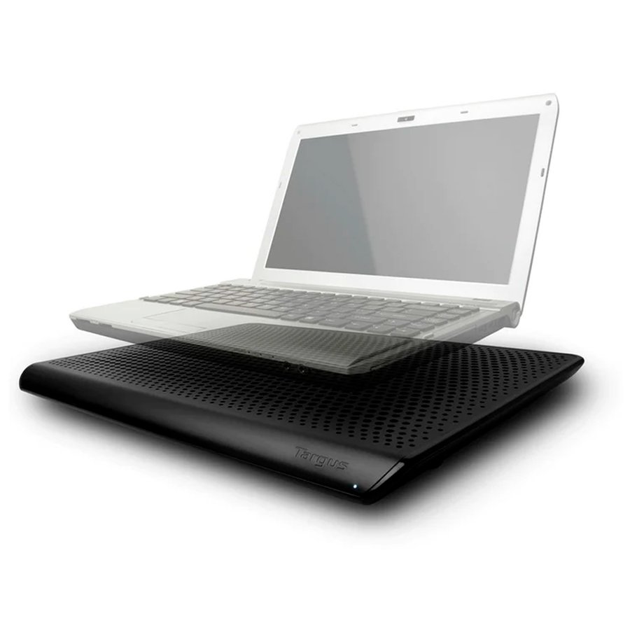 - Enfriador Laptop Chill Mat para portátiles Targus cuenta con dos ventiladores que generan aire frío para que la computadora continúe funcionando de manera eficiente.