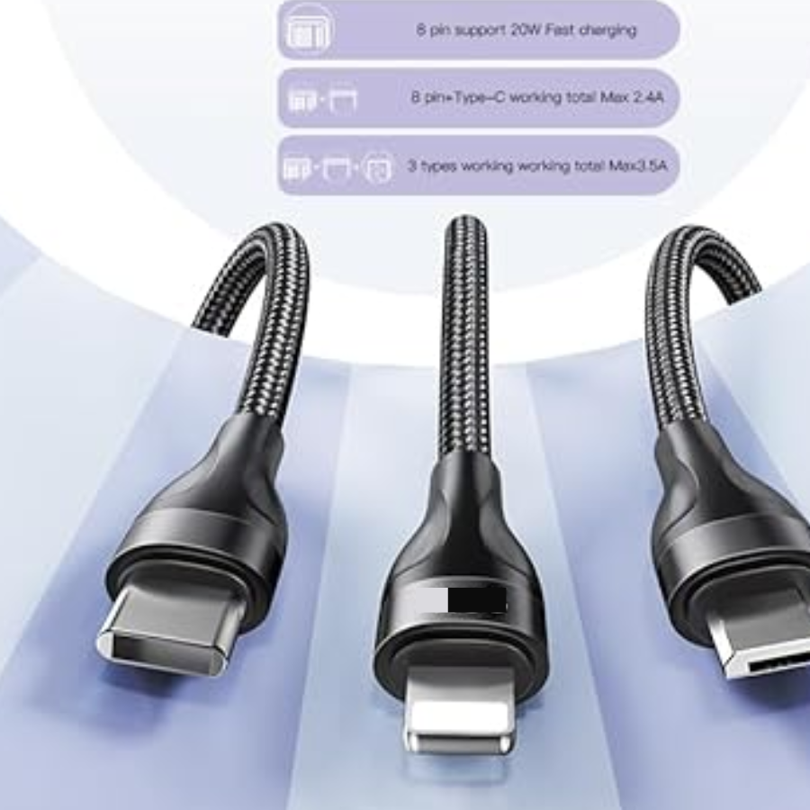 • 1 cable que carga todo: este cable combina iluminación de Apple/tipo C/Micro USB tres tipos de conector todo en uno. Satisface la mayoría de las necesidades de carga para todos tus dispositivos y, quizás también, para todos los miembros de tu familia.