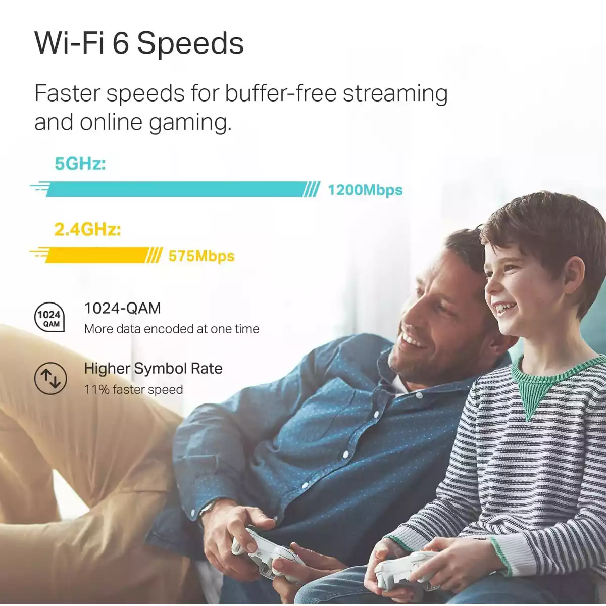 + Conexiones más rápidas: Wi-Fi 6 velocidades de hasta 1,800 Mbps: 1,201 Mbps en 5 GHz y 574 Mbps en 2.4 GHz.