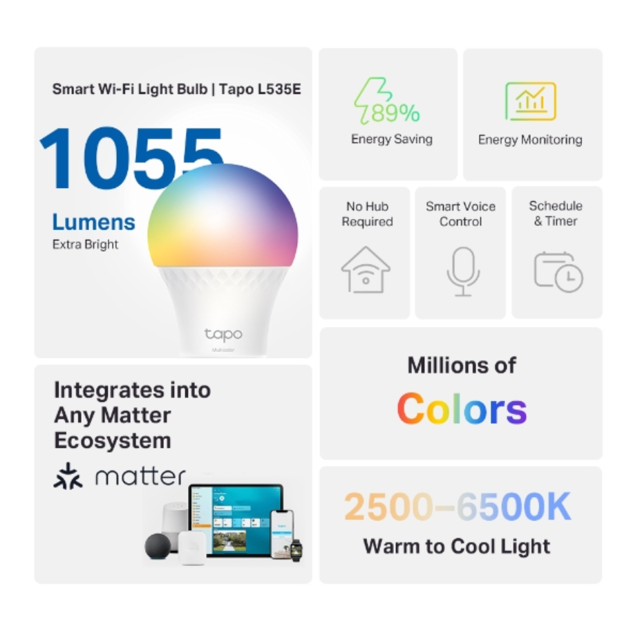 • Compatible con Matter. Gracias a la compatibilidad con Matter, Tapo L535E puede funcionar sin problemas con otros productos certificados de otras plataformas.